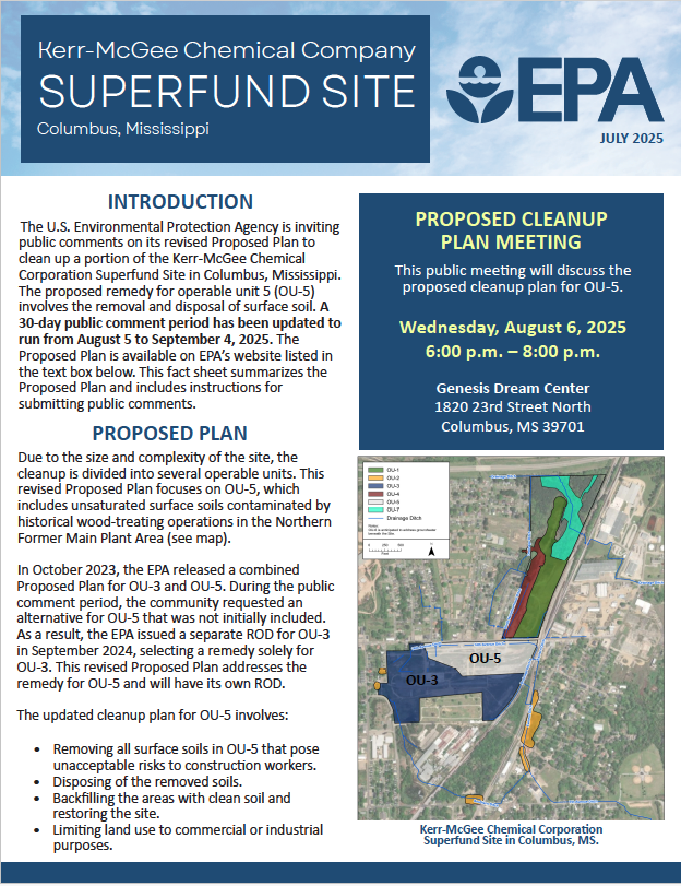 The U.S. Environmental Protection Agency (EPA), together with the Multistate Trust and the Mississippi Department of Environmental Quality, hosted a public meeting on August 6 to discuss the Revised Proposed Plan for cleanup of Operable Unit 5 (OU5) at the Site. OU5 is the Northern Former Main Plant Area.