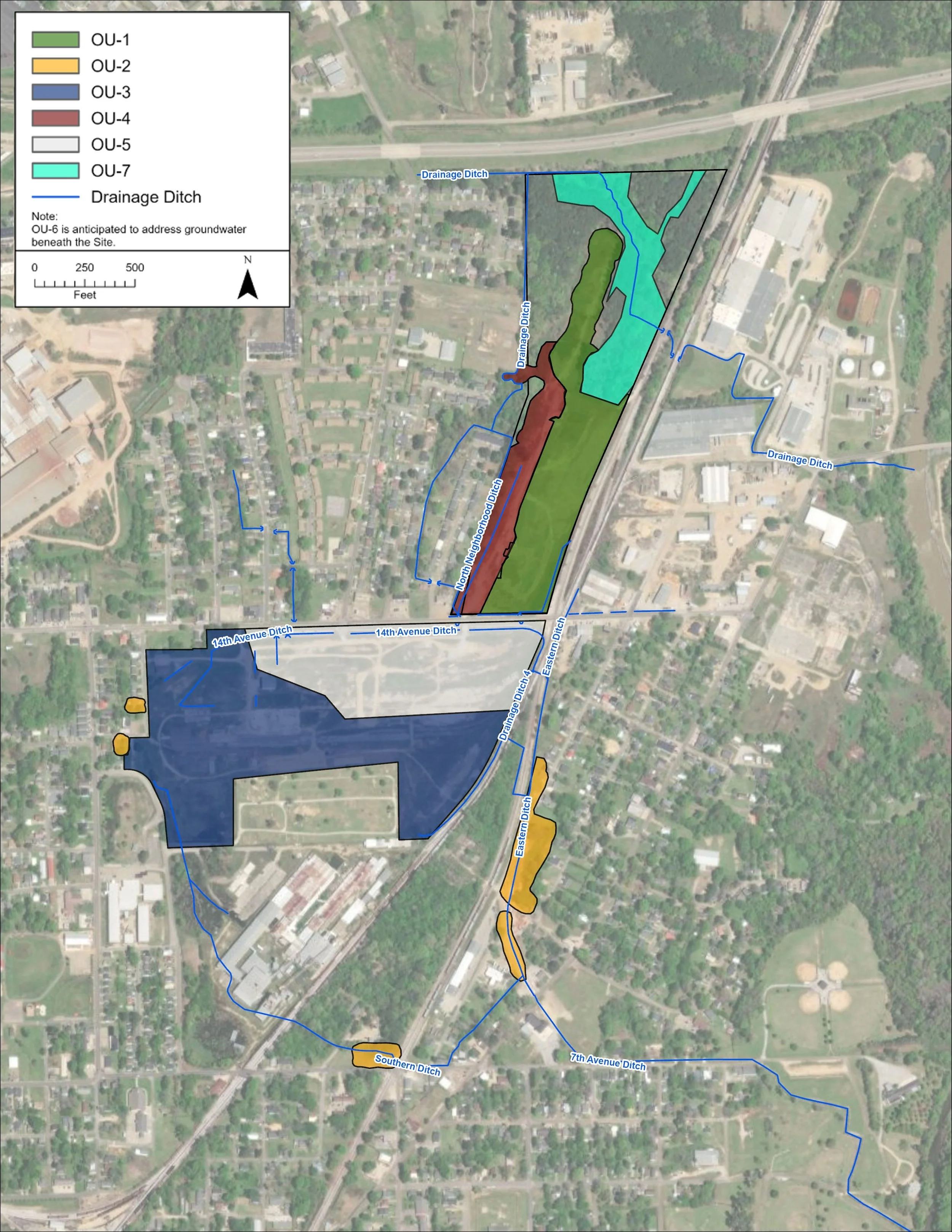 A Superfund site is often divided into sections, called Operable Units or OUs, based on their investigation and cleanup needs.